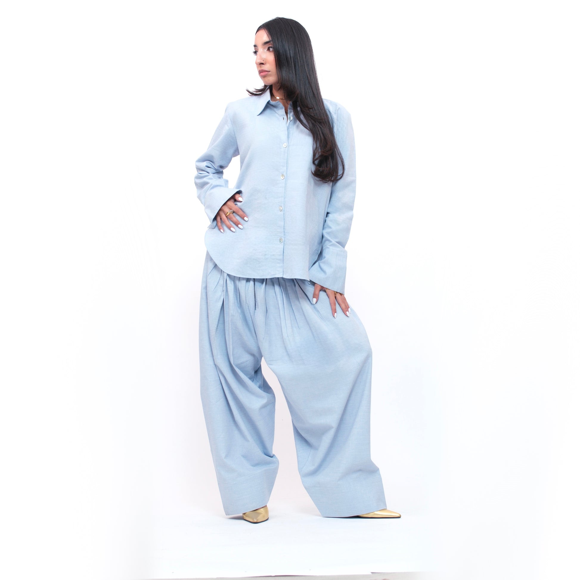 Step into effortless style with this Denim Effect Farshi Kameez. Crafted from yarn dyed fabric, its blue stripes add a lively touch to the relaxed fit. The button-down front and back show off a charming variation in length, while the pleated back and longer cuffs bring a playful, unique twist to your look. Perfect for those who love comfort with a dash of personality!